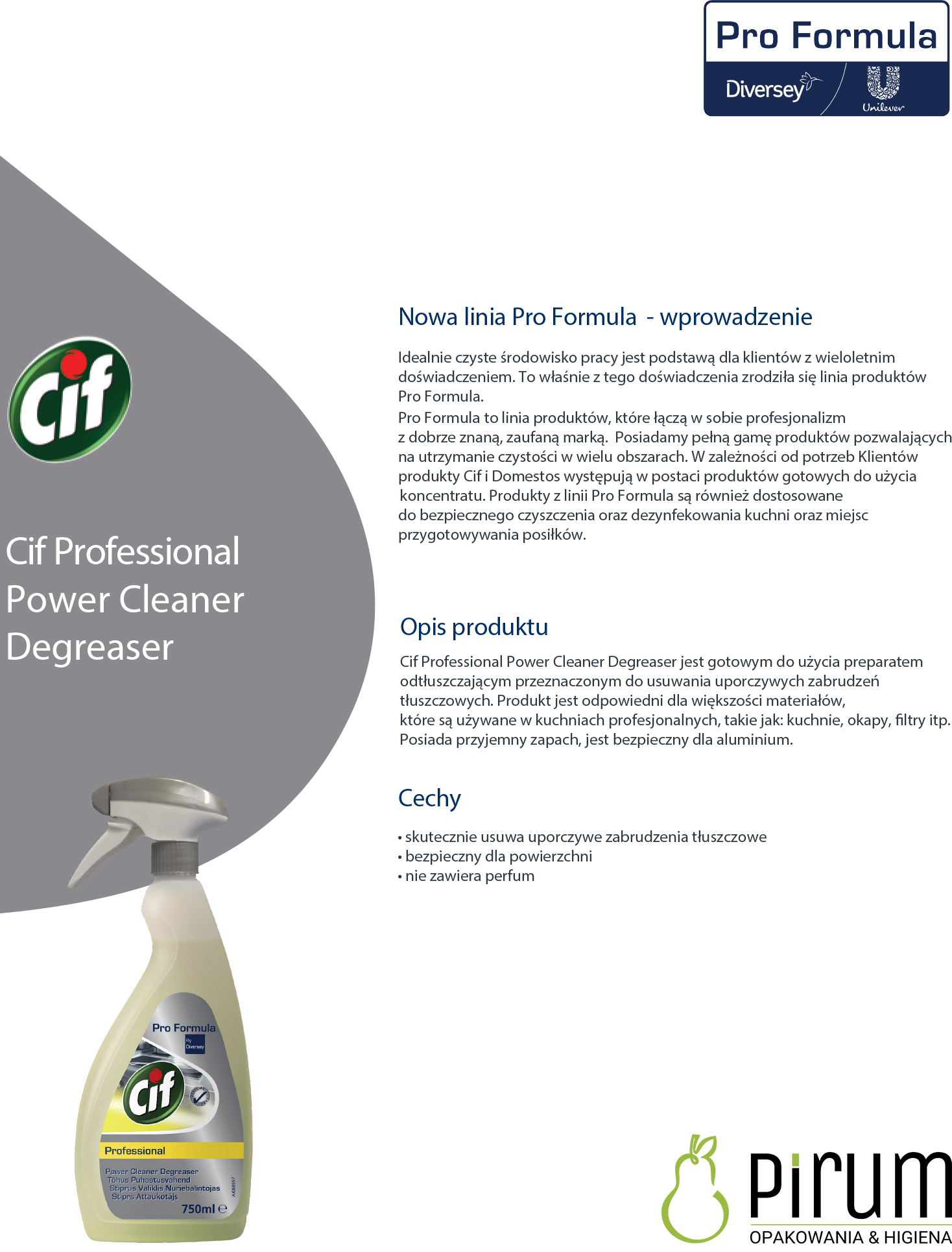 Cif Professional Power Cleaner Degreaser jest gotowym do użycia preparatem odtłuszczającym przeznaczonym do usuwania uporczywych zabrudzeń tłuszczowych. Produkt jest odpowiedni dla większości materiałów, które są używane w kuchniach profesjonalnych, takie jak: kuchnie, okapy, filtry itp. Posiada przyjemny zapach, jest bezpieczny dla aluminium.