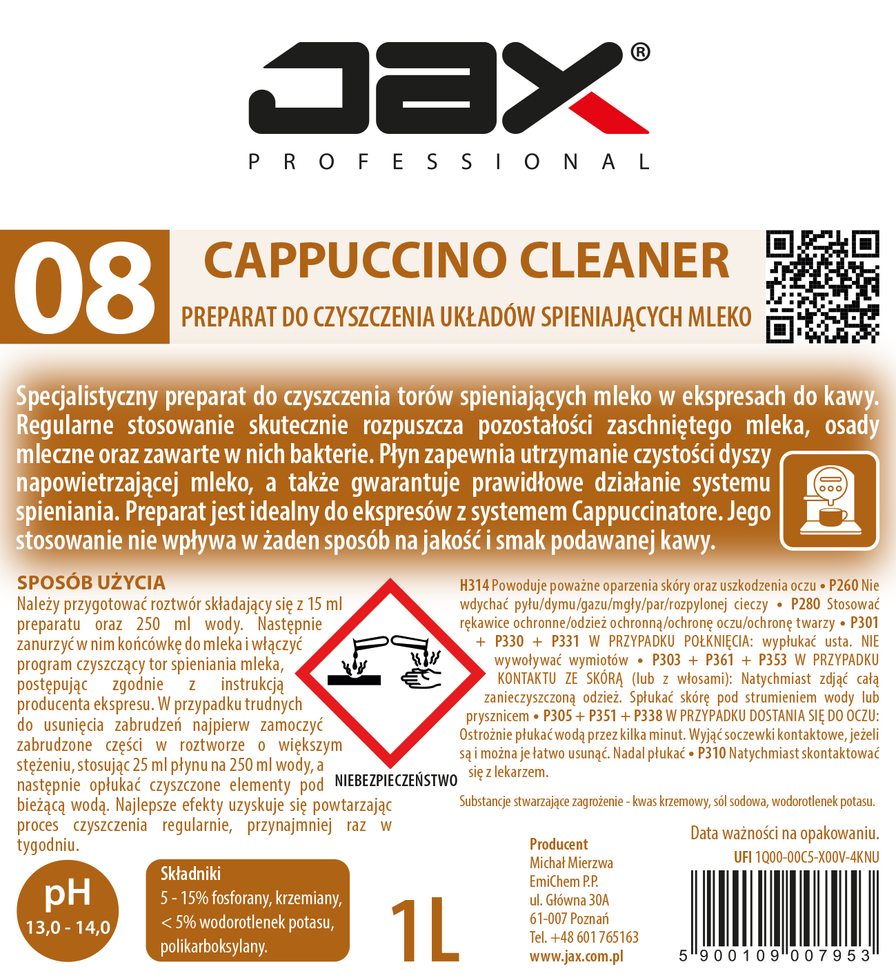JAX PROFESSIONAL 08 1L CAPPUCCINO CLEANER - PREPARAT DO CZYSZCZENIA UKŁADÓW SPIENIAJĄCYCH MLEKOSpecjalistyczny preparat, który skutecznie rozpuszcza pozostałości zaschniętego mleka, osady mleczne oraz zawarte w nich bakterie.