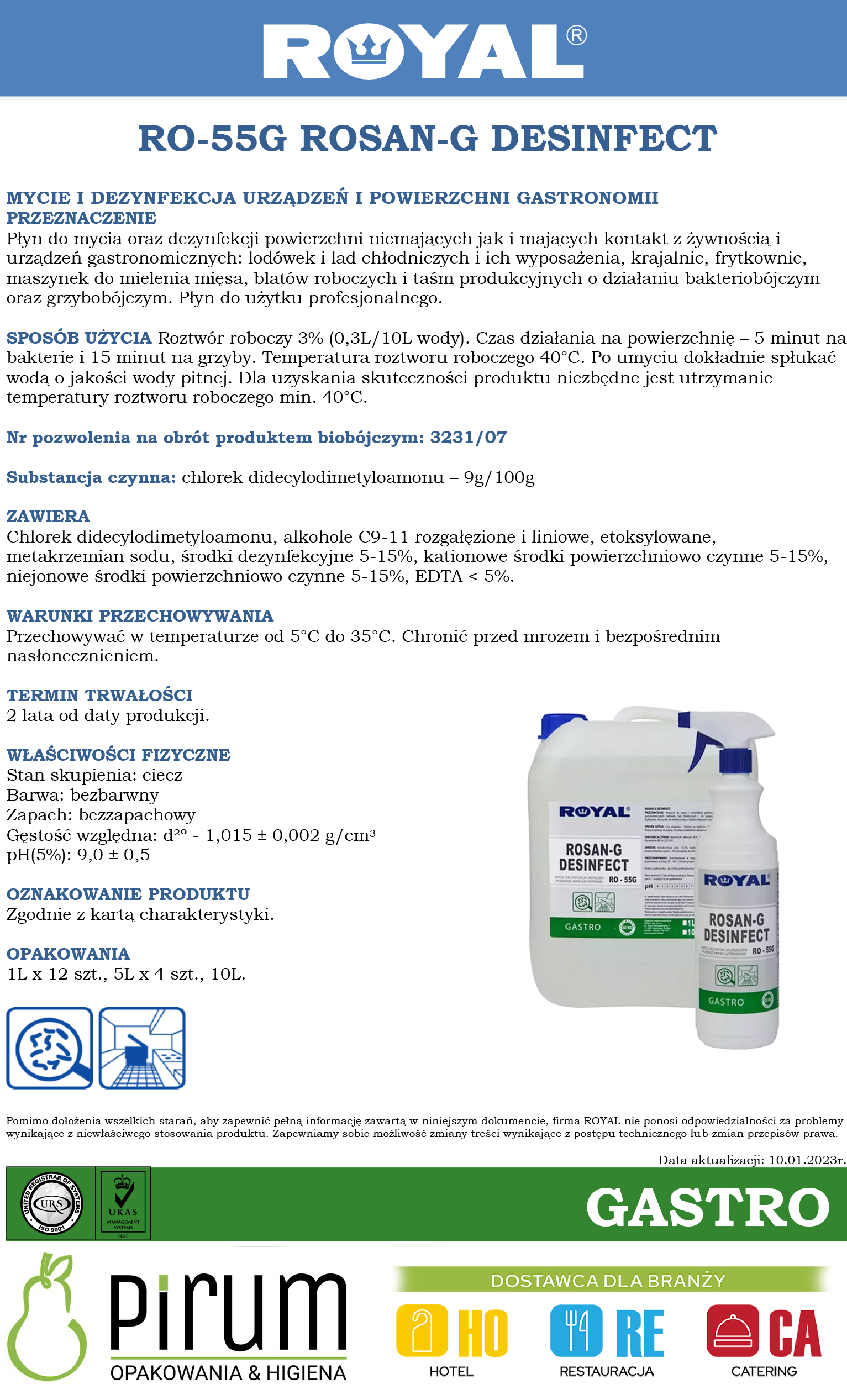 Preparat do mycia i dezynfekcji powierzchni i urządzeń gastronomicznych: lodówek, lad chłodniczych i ich wyposażenia, krajalnic, frytkownic, maszynek do mielenia mięsa, blatów roboczych i taśm produkcyjnych. Do użytku profesjonalnego.Charakterystyka: